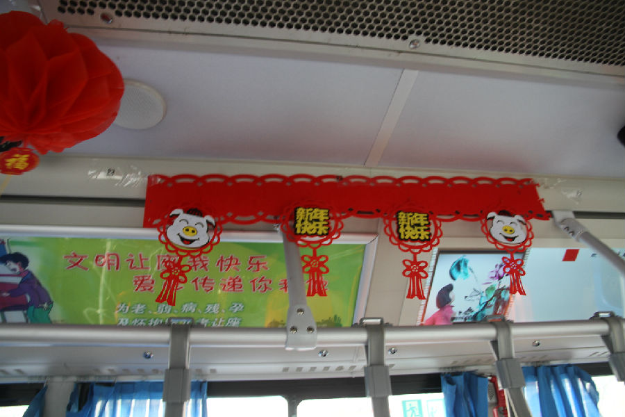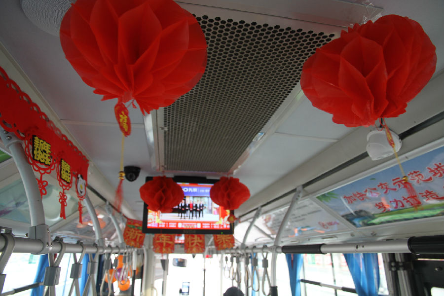 原來這些喜慶的設施都是十八路的車長自發(fā)組織自籌資金購置的,同時利用頭天晚上收車后的時間掛好的。據(jù)一分公司經(jīng)理趙廣漢介紹,此次活動是十八路認真貫徹落實總公司關(guān)于打造特色分公司和特色公交路隊總體工作要求的一次積極探索和有效嘗試,既為乘客提供了更加溫馨的乘車環(huán)境,扮靚了車廂、提升了形象,又為一分公司其他路隊起到了很好的示范作用。