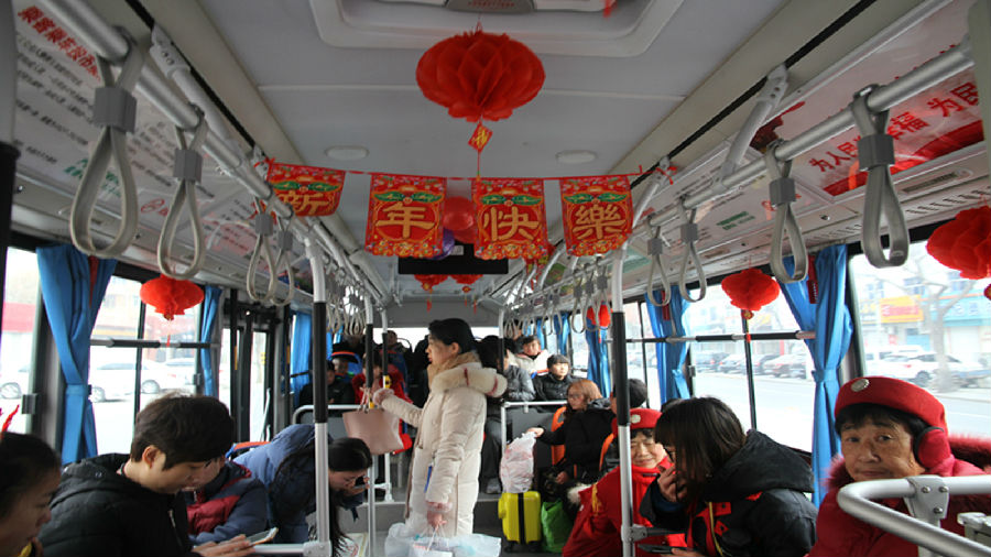 除夕當天,不少乘坐十八路公交車的乘客發(fā)現(xiàn),車廂內(nèi)與以往有了很大的變化,火紅的小燈籠、頑皮的卡通形象、喜慶的中國結(jié)、暖暖的新春祝福......車廂內(nèi)掛滿了大大小小的裝飾物,充滿了濃濃的年味,伴隨著乘客臉上洋溢著驚喜的笑容,無不映襯著過年的喜慶氣氛,有的乘客還在拿著手機拍照。