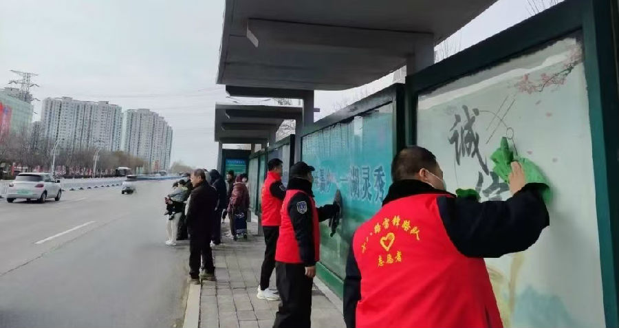 在公交候車站臺(tái)上,18路隊(duì)車長(zhǎng)們車長(zhǎng)們拿著抹布、鏟子、水盆等工具,擦亮了公交站牌、公益展板,擦洗了候車長(zhǎng)凳、櫥窗,鏟除了小廣告等。為乘客提供了一個(gè)干凈、整潔、文明有序的乘車環(huán)境。