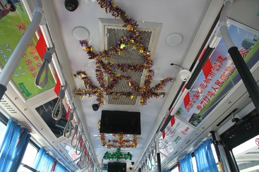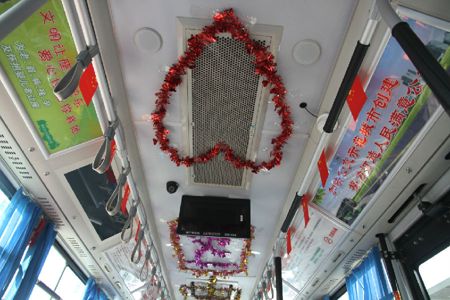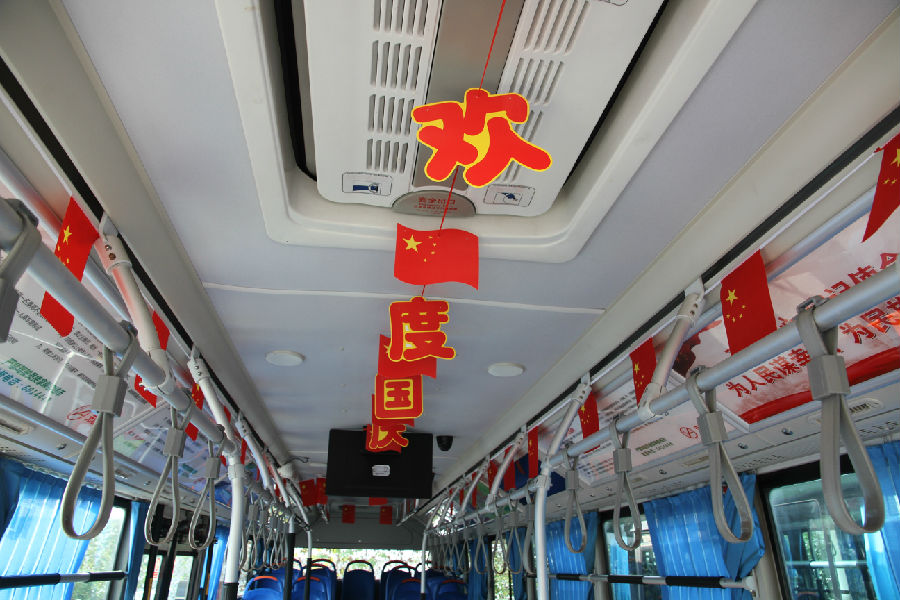 記者看到,國慶主題公交車的外觀與普通公交車無異,但進(jìn)入車廂就發(fā)現(xiàn),在車廂頂部,兩邊各懸掛著整齊、鮮艷的國旗,有的在頂部還裝飾有“歡度國慶”“中國萬歲”等醒目標(biāo)語和“中國心”圖案。同時(shí)市公交總公司每名司機(jī)的右臂上還戴了一枚國旗貼。這一裝扮令人耳目一新的同時(shí),也讓人感受到濃濃的國慶氣氛。一位乘客說:“今年是新中國成立70周年,一上車就看到車廂內(nèi)有這么多國慶元素,心里很激動(dòng),我為祖國而自豪”。不少乘客更是拿出手機(jī)拍照留念。司機(jī)和乘客共同處在這樣的氛圍中,濃濃的愛國情懷在每個(gè)人心中涌動(dòng)。
