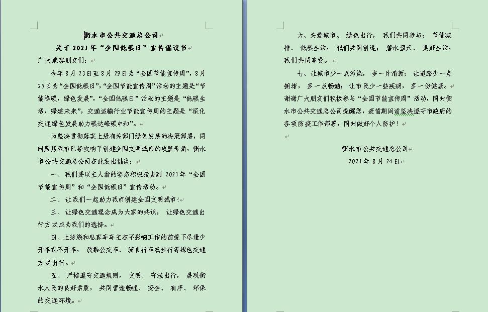 低碳出行倡議活動?偣疽8月23日至29日“全國節(jié)能宣傳周”為契機,在公司內(nèi)部開展少用一張紙、節(jié)約一度電、做好垃圾分類等活動,并利用“衡水公交微信公眾號”向社會發(fā)出“衡水市公共交通總公司關于2021年全國低碳日宣傳倡議書”。