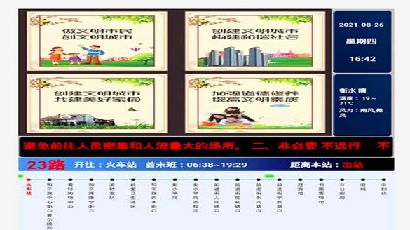 公益廣告提升活動。近日,總公司對公交關于廣告宣傳內(nèi)容進行了全方位整改提升,截至8月27日,公交站亭更換公益廣告73塊,共建小區(qū)更換公益廣告2塊,210余部公交運營車輛車載節(jié)站屏更新公益廣告內(nèi)容,450部運營車輛安裝文明禮讓宣傳展板,火車站10座電子站牌全部更新公益廣告內(nèi)容。