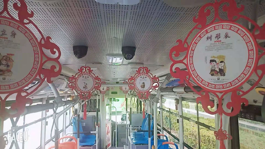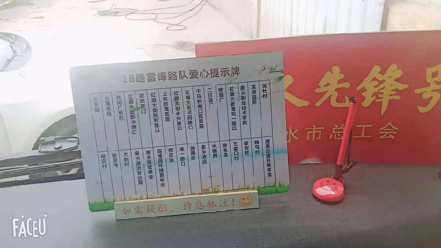 為防止乘客坐過站,他們精心設(shè)計(jì)了“下車溫馨提示牌”和 “到站提示卡”。為防止乘客雨天上下車摔倒,他們?cè)谇昂箝T臺(tái)階處放置了“愛心防滑腳墊”。為滿足乘客臨時(shí)需求,他們?cè)诠ぷ髋_(tái)上設(shè)置了“雷鋒服務(wù)包”,里面裝有一次性口杯、針線包、暈車藥、塑料袋和創(chuàng)可貼等便民物品。夏天為乘客準(zhǔn)備了便民小扇子,冬天為老弱病殘?jiān)械忍厥馊后w配備了棉坐墊。車廂內(nèi)還備有便民雨傘、一次性雨衣、應(yīng)急口罩等物品。為提升車廂文化,他們還放置了一個(gè)閱讀書架,上面擺放著他們自制的“衡水公交18路風(fēng)采”等書畫資料。