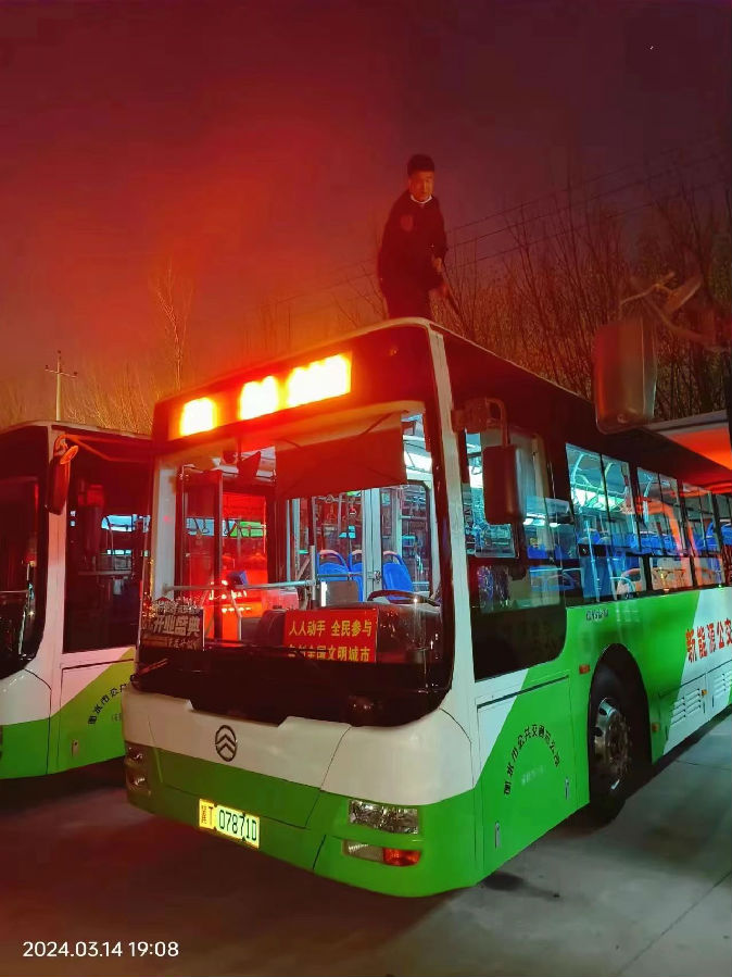 加強(qiáng)公交站亭巡查維護(hù)及公交車輛保潔力度,及時(shí)發(fā)現(xiàn)并維護(hù)站亭設(shè)施、清理小廣告等問題;運(yùn)營中“半趟一巡視,一趟一清理”,保持公交車輛內(nèi)、外環(huán)境整潔。為乘客提供舒適整潔的候車、乘車環(huán)境。